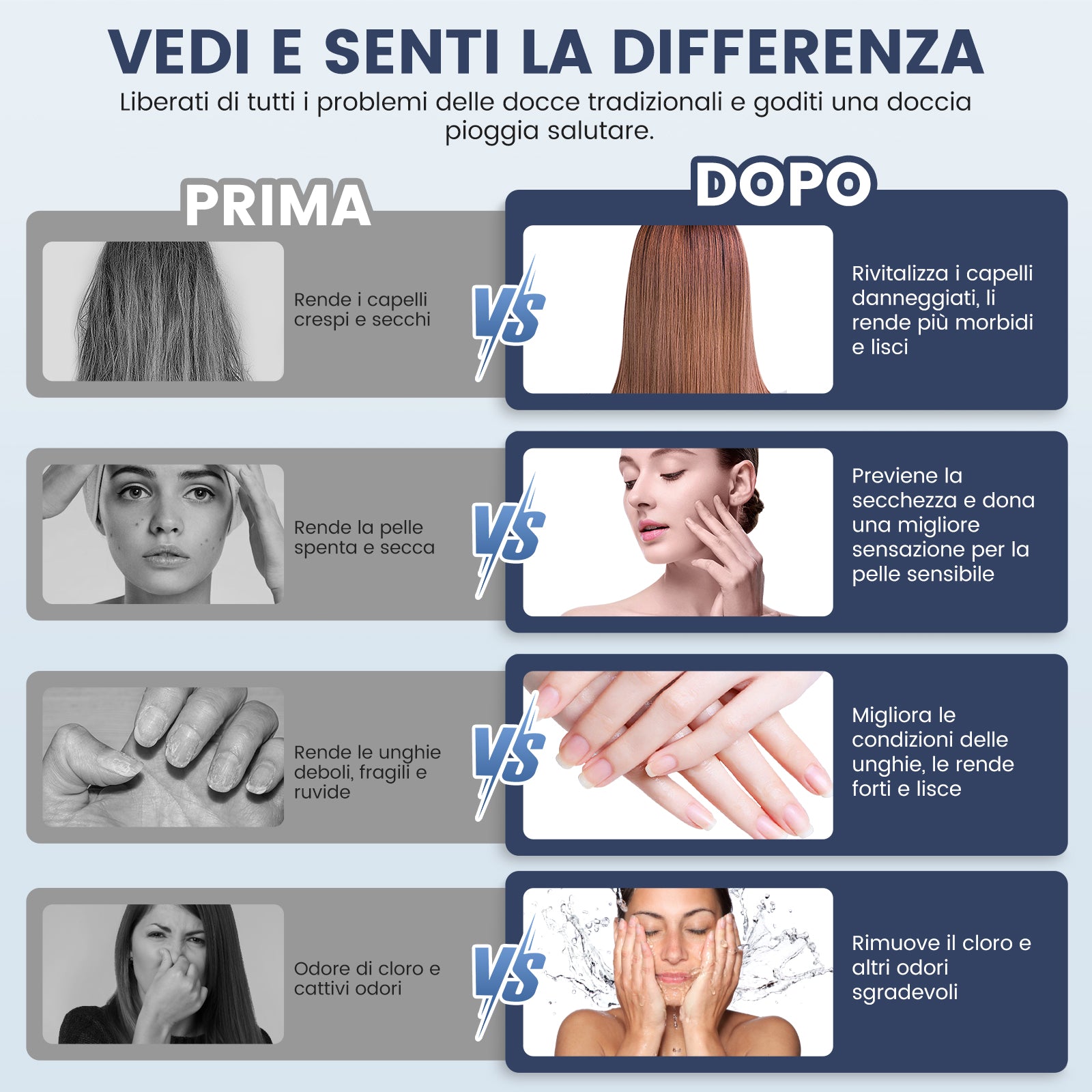 - Lo Que Debes Saber Sobre el Agua de Baño: ¿Tienes problemas de piel sensible, cabello reseco o mal olor en el agua de la ducha? El 75% de los hogares europeos usa agua clorada del grifo, y en algunas zonas el agua es particularmente dura. Los estudios muestran que la piel absorbe el 63% del agua durante la ducha, y que el cloro residual y los metales pesados pueden dañar la barrera cutánea. Usar un sistema de filtración profesional puede proteger eficazmente la salud de tu familia. Por eso necesitamos filtrar el agua de baño